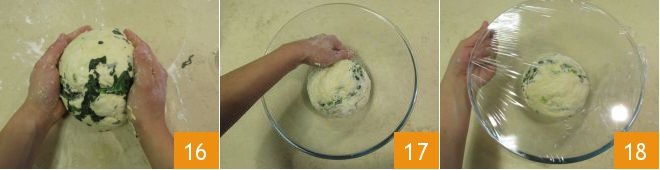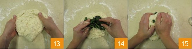 At this point, flatten the dough 13 and place the well-chilled turnip greens in the center 14. Knead with your hands to incorporate them into the dough 15, adding more flour if it turns out too moist.