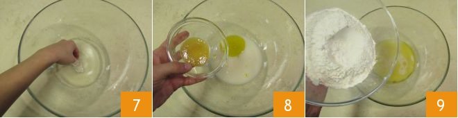 and mix with your hands or a spoon to dissolve it completely 7. Add oil and honey 8, then gradually add the flour 9