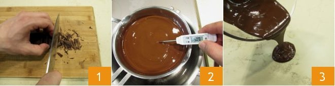 The chocolate should reach a temperature of 79/81°F. Then, pour it into the bowl where you left the 1/3 of chopped chocolate and mix to melt it; measure the temperature which should be 81/82°F. If during these phases the temperature drops too low, always keep the pot of the bain-marie with hot water handy to slightly warm the chocolate. Conversely, if it's still too hot, repeat the operation of spreading on marble with a small part of the chocolate.