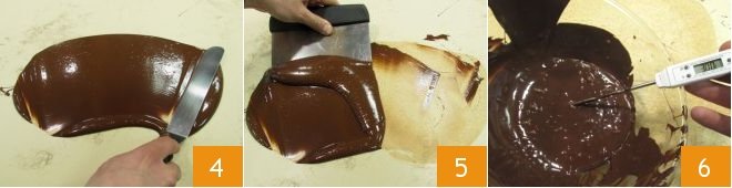 begin to work the chocolate on the marble slab, with a spatula 4 and a scraper 5, spreading it on the surface. When it reaches 82°F, transfer it to the bowl where you left the remaining 1/3 of the chocolate and mix: the chocolate should reach 88/90°F 6. If during these phases the temperature drops too low, always keep the pot of the bain-marie with hot water handy to slightly warm the chocolate. Conversely, if it's still too hot, repeat the operation of spreading on marble with a small part of the chocolate.