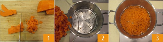 To make the two-tone cocoa and pumpkin cookies, first prepare the pumpkin. Peel it and cut it into cubes 1. Steam until it becomes soft 3.