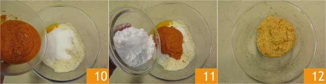 Also add the pumpkin pulp 10, potato starch 11, sugar, and knead 12.