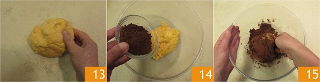 You should obtain a homogeneous dough 13. Divide the dough into two equal parts. Keep one as it is and add cocoa to the other 14. Work to mix well 15.