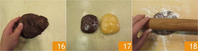 This will give you a dark dough 16. Cover both doughs with plastic wrap 17 and let them rest in the fridge for 30 minutes. After the time, roll out the dark dough to a thickness of about ¼ inch.