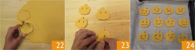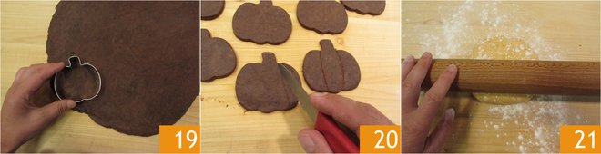 Cut out 20 cookies with pumpkin-shaped cutters about 2¾ inches 19. Make cuts with a small knife 20. Now roll out the light dough in the same way 21.