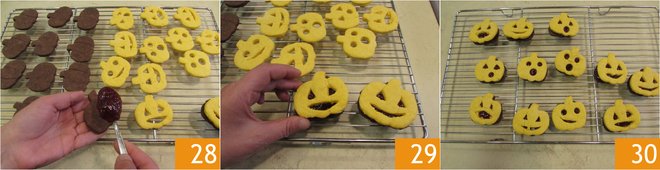 Fill the dark cookies with jam 28 and close them with the light cookie 29. The two-tone cocoa and pumpkin cookies are ready to be enjoyed 30.