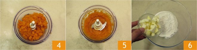 Once cooked, blend it 4 to obtain a puree 5, you'll have about 7 oz (200 g) of puree. Let it cool. Once the pumpkin is cool, prepare the shortcrust pastry. Pour the flour and butter into a bowl 6.