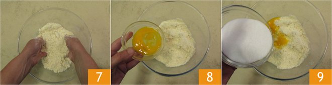 Work with your hands to create a sandy texture 7, then add the egg yolk 8 and sugar 9.