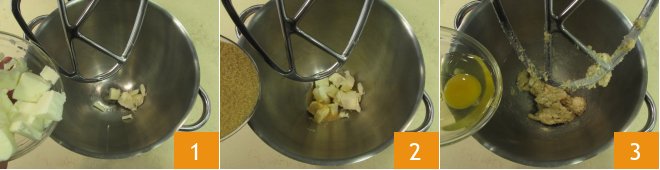 To prepare the two-tone cookies, pour the cold cubed butter 1 and brown sugar 2 into the bowl of the stand mixer. Mix the ingredients with the paddle attachment for a couple of minutes, then add the egg at room temperature 3. Mix until you obtain a homogeneous mixture.