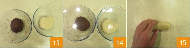 When you have obtained two homogeneous doughs 13, cover with plastic wrap 14 and let them rest in the refrigerator for at least 30 min. Remove the doughs from the refrigerator. Start with the white one. Take it and work it on the surface to form a loaf 15 about 0.4 inches thick.