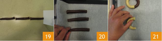 Now take a cocoa strip, shape it the same way, and place it on one side above the white dough and on the other side below. Then gently press them together with your hands 22. You will get cookies with a diameter of about 3 inches. Continue this way until you finish the strips and form all the cookies 23. Now proceed to baking: bake the cookies in a preheated static oven at 338°F for 25 minutes, on the middle rack, using the static oven. Then remove from the oven and let cool 24 before transferring the cookies to a tray or a tin box.