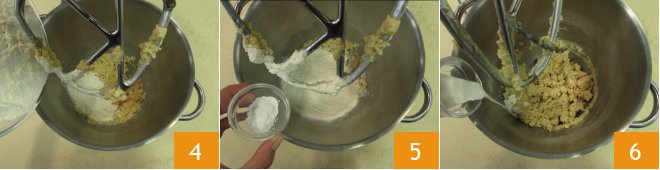 Add the all-purpose flour 4 and the previously sifted baking powder 5 to the mixture. Mix for a few seconds and also add the fresh cream 6.