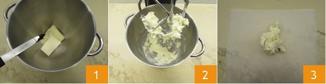 To prepare the two-tone croissants, first make the butter that you will subsequently use for laminating. In the bowl of a stand mixer, place the 250 g of softened butter, add the seeds of the vanilla pod 1, and work it with the flat beater 2. Transfer the butter onto a sheet of parchment paper 3.