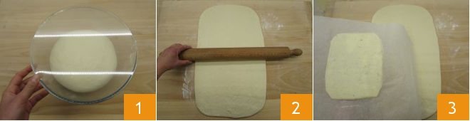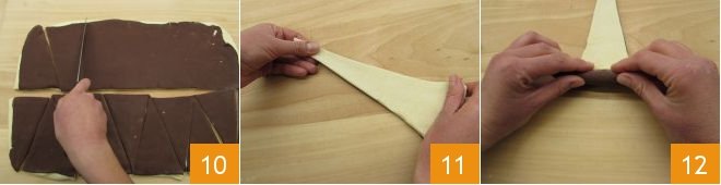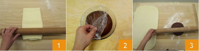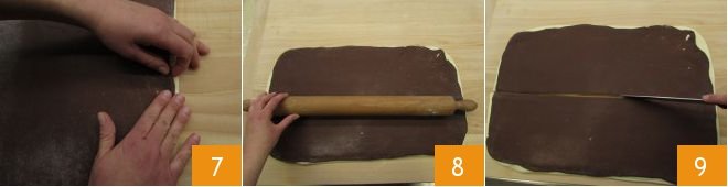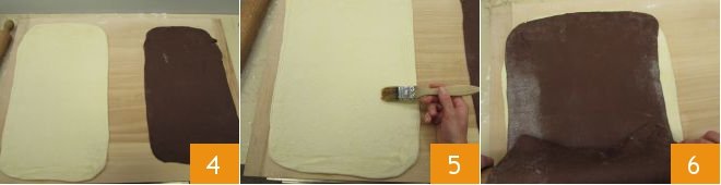 Take the puff pastry (white dough) and roll it out with a rolling pin to form a rectangle measuring 20x14 inches, about ¼ inch thick 1. Now take the cocoa dough, which should be well risen by now 2, and roll it out with the rolling pin 3