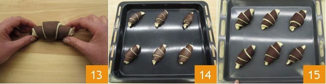 until you form the classic croissant shape, making sure to position the closure at the base 13. Continue in this way with all the others, placing them on a baking sheet lined with parchment paper and spacing them apart 14. Let them rise for an hour in a turned-off oven with just the light on, or in any case, away from drafts that would dry out the surface 15.