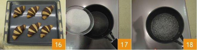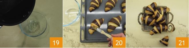Transfer the syrup to a small bowl 19 and let it cool slightly, then use it to brush the hot croissants 20. The two-tone croissants are ready to be enjoyed 21!