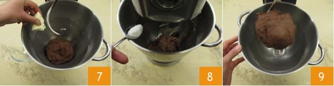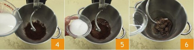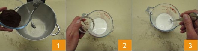 When the 12 hours are almost up, prepare the cocoa dough. In the bowl of a stand mixer equipped with the hook attachment, add the two flours and cocoa 1. Dissolve the yeast in the room temperature milk 2 3.