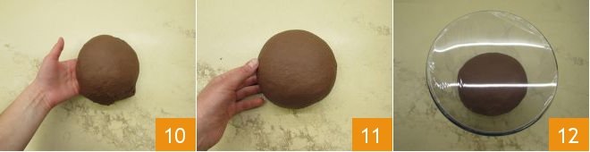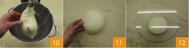 Then transfer the dough onto a work surface 10 and shape it into a round ball 11. Once you have formed a ball, place it into a large bowl 12, cover with plastic wrap, and let it rise at room temperature until needed: this will take about 3 hours.