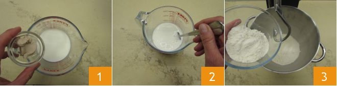 Now, make the white dough. Dissolve the yeast in the room temperature milk 1 2. In the bowl of a stand mixer equipped with the hook attachment, pour in the two flours 3,