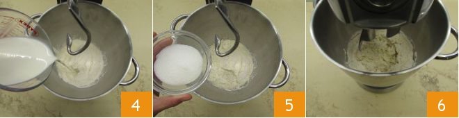 add the milk in which you dissolved the yeast 4 and the sugar 5. Turn on the stand mixer 6