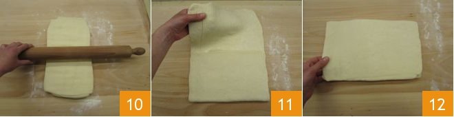 Roll it out again in the direction of the folds until you obtain a thickness of ¼ inch 10. Now make the first 3-fold: bring one end of the dough towards the center of the rectangle, pushing it slightly beyond 11, then fold the opposite part over it 12. Lifting the dough, you should see the 3 folds.