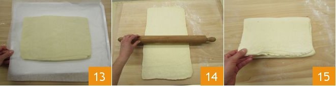 Transfer onto a tray lined with parchment paper 13 and let it chill in the refrigerator for 30 minutes. Then roll it out again 14, make the second 3-fold 15, and return to the refrigerator for 30 minutes. Retrieve the dough and make the third and final 3-fold in the same manner. Finally, refrigerate for 1 hour.