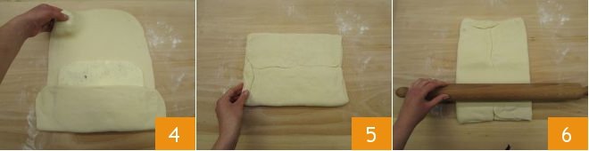 Bring the edges of the dough towards the center 4, making them meet but not overlap 5: this way, you will encase the butter slab. Rotate 90° and roll it out to a thickness of ¼ inch 6.