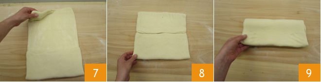 Now make the first 4-fold. Bring one of the two edges towards the center 7, then fold the other edge so that they meet 8. Close the dough like a book 9 and refrigerate for 30 minutes.