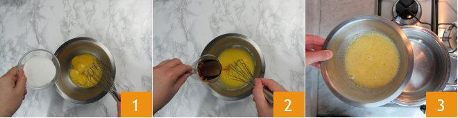 To prepare the two-tone roll with zabaglione, start with the latter. In a mixing bowl, pour the yolks and sugar 1, mix them with a whisk before incorporating the Marsala wine 2. Then place the bowl in a pot with water and cook in a double boiler over low heat, stirring continuously 3.