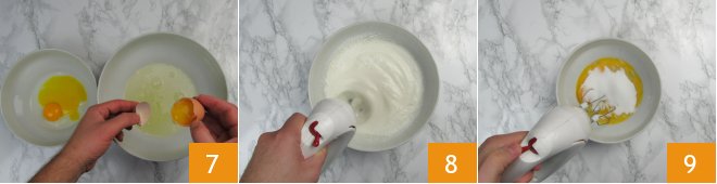Meanwhile, move on to the sponge cake. Separate the yolks from the egg whites 7 and whip the whites to stiff peaks with an electric mixer; once ready, place them in the refrigerator 8. Move on to the yolks, add the sugar, and whip these too 9.