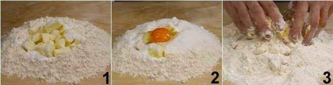 To prepare the Tyrolean cookies with strawberry jam, start by placing the flour in a fountain shape on a work surface (or in a large bowl), previously mixed with baking powder and sifted, sugar, the seeds from a vanilla bean, salt, butter in pieces 1, and the egg 2. Mix and knead all the ingredients well 3,