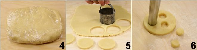 After the necessary time, take the dough, roll it out to a thickness of about 1/8 inch, and use cutters or a pastry ring to create circular shapes about 2 inches in diameter 5. You should have an even number, as each cookie consists of a whole bottom part and a top part with three holes (which you'll make with an apple corer) 6;