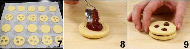 As soon as they are baked, while still warm, take a non-holed shape and place half a teaspoon of jam in the center 8; then place on top, pressing lightly, a shape with holes 9 and place the assembled cookie on a tray: do this with the remaining shapes.