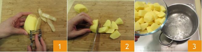 To prepare the Tyrolean gröstl, start with the potatoes. Peel them with a peeler or paring knife 1 and then cut them into chunks about 3/4 inch in size 2. Place them in a pot with plenty of boiling water and cook for about twenty minutes 3.
