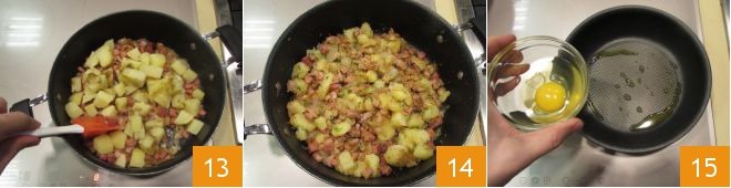 stir and let it all infuse for a few more moments 13. Your gröstl is now ready 14, just missing the fried egg. In a small pan with a drizzle of oil, pour one egg at a time from a small bowl 15.