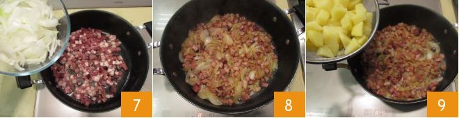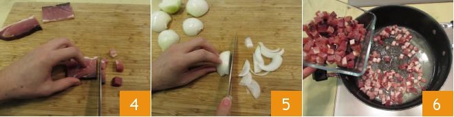 Meanwhile, dice the speck into pieces about 1/2 inch 4. Then finely slice the already peeled onion 5 and move to the stove. Heat a saucepan and melt the butter inside. Then add the diced pancetta and speck 6.