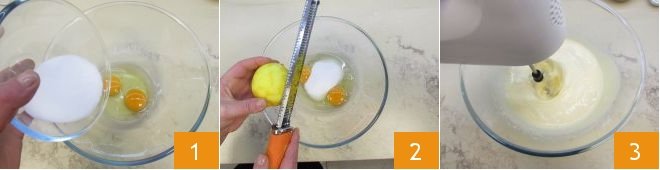 To make the upside-down banana cake, start by preparing the batter: place the whole eggs in a bowl, add the sugar 1 and lemon zest 2, beat the ingredients with an electric mixer until you get a fluffy and light mixture 3,