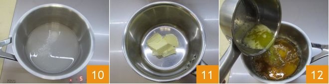 heat over moderate heat to dissolve the sugar 10 and let it brown to create the caramel, swirl the saucepan occasionally to mix. Meanwhile, melt the butter in another saucepan 11, when the caramel is browned, add the melted butter 12