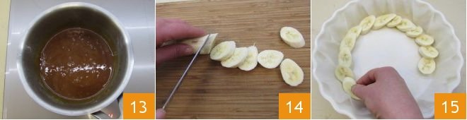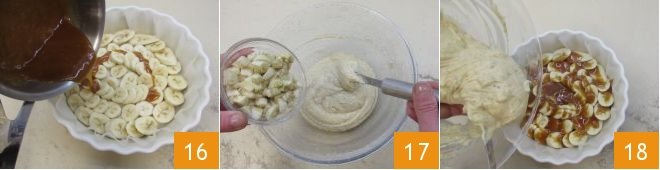 Pour the caramel over the bananas 16, and then after adding the diced bananas to the batter 17, pour the mixture into the pan as well 18.