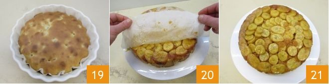 Bake the cake in a static oven at 340°F for 35 minutes (or in a convection oven at 300°F for 25 minutes). Once cooked, remove the pan from the oven 19 and let it cool slightly for 5 minutes, then turn it upside down onto a serving plate, remove the pan and gently peel off the parchment paper from the base 20. Your upside-down banana cake is ready to be enjoyed 21.