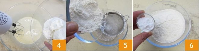 also add the Greek yogurt 4. Sift the flours 5 and then add the baking powder 6.