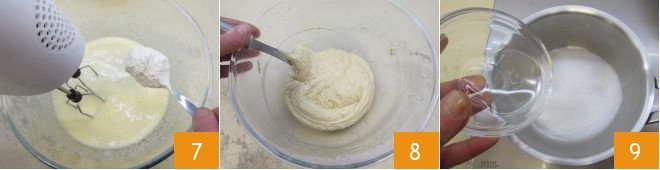 Add the dry ingredients to the batter one tablespoon at a time 7, mix with the electric mixer to combine the mixture 8. Meanwhile, prepare the caramel, pour the granulated sugar and water into a saucepan with a thick bottom 9,