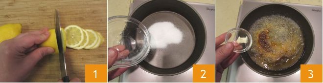 To make the upside-down lemon cake, first wash and dry the 3 lemons well, then cut them into slices 1/8 inch thick 1. In a flared pan measuring 9 inches at the edge and 7.5 inches at the bottom, pour the sugar and water 2, and bring to a boil to caramelize. When the syrup turns amber, add 1 tsp of butter 3 and swirl the pan to mix it, then turn off the heat.