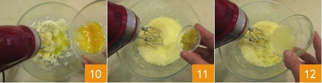 Incorporate the eggs 10, then flavor with the lemon zest 11 and its juice 12.
