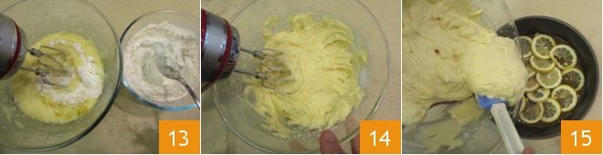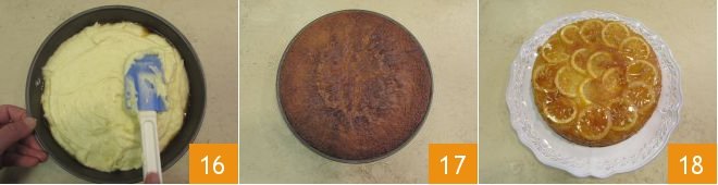 Level the surface with a spatula 16 and bake in a preheated static oven at 356°F for 45 minutes on the middle rack. Once baked, remove the cake 17 and invert it while still hot onto a serving plate, being careful not to burn yourself. Let the upside-down lemon cake cool before serving 18.
