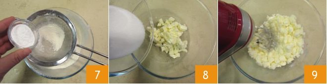 Sift the baking powder as well 7 and set aside. In a bowl, place the room temperature butter cut into pieces and add the sugar 8. Beat the mixture with an electric whisk 9.
