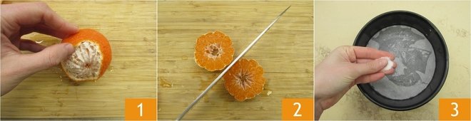 Arrange the mandarins inside with the cut side down on the parchment paper 4. At this point, sift flour, starch 5, and baking powder 6 into a large bowl.