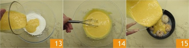 Then transfer it into the bowl with the dry ingredients 13 and mix until you obtain a homogeneous mixture 14. Pour into the pan 15.