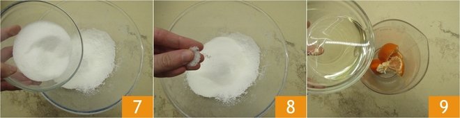 Add the sugar 7, a pinch of salt 8, and mix. Set the dry ingredients aside. Pour into the bowl of an immersion blender a well-washed, unpeeled mandarin cut into pieces. Add the vegetable oil 9.