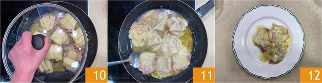 When the meat is well browned, deglaze with white wine and let the alcohol evaporate completely to get a fragrant and tasty base 7. At this point, slightly lower the heat and place a slice of cooked ham 8 and a slice of Fontina 9 on each piece of meat.